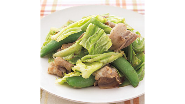 3.フライパンにオリーブ油小さじ1を熱し、豚肉を炒める。肉の色が変わったら強火にし、スナップえんどう、キャベツの順に加えてそのつど炒める。キャベツに焼き色がついてきたら、にんにくバターを加えて手早く炒め合わせ、塩小さじ1/4、こしょう少々で調味する。