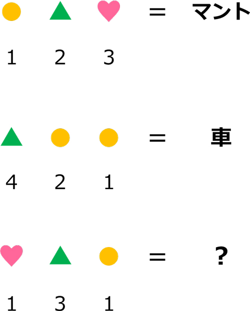 ある法則に基づいて△〇♡の記号とその下に数字が書かれています。「?」に当てはまる単語は次のうちどれでしょうか