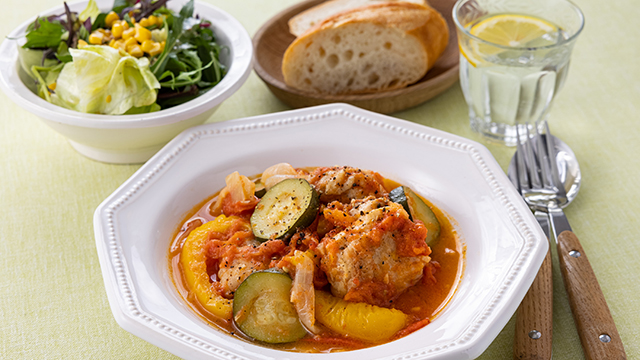 忙しい毎日でも「冷凍つくりおき」があれば、簡単にその日のメイン料理が完成!料理研究家の阪下千恵さんにとっておきの「冷凍つくりおきレシピ」を教えてもらいました。お肉や野菜をじっくり煮込んだイタリアの家庭料理「カチャトーラ」。チキンに加えて、トマトやパプリカ、ズッキーニなど野菜も栄養もたっぷりです。冷凍ストックがあれば当日は解凍して煮るだけ!季節のサラダ、バゲットと合わせて贅沢ディナーに。