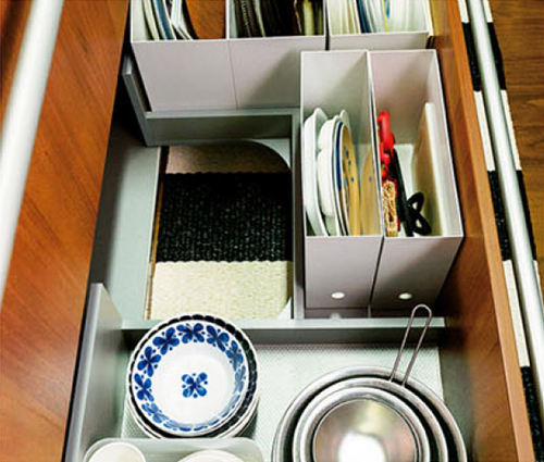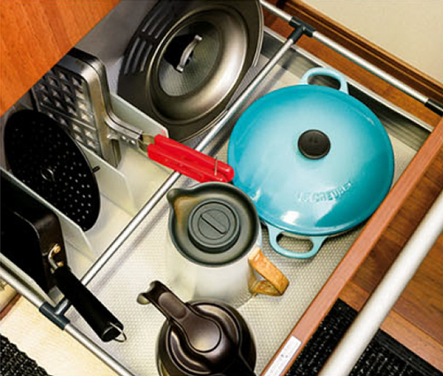 深さのある引き出しには、大きめのプレートを立てて収納。ボウル・ザルなども。
