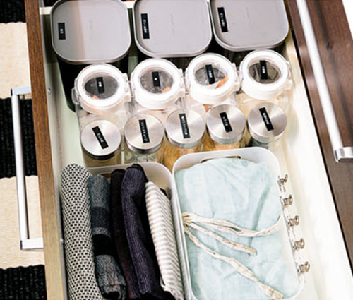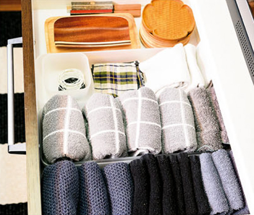 ふきん類は、色味をグレー系に統一。中は無印良品の整理ボックスで仕切って。