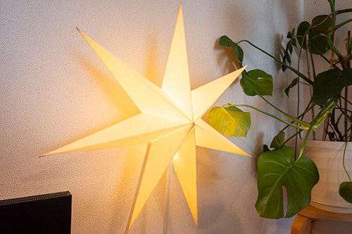 ライトにもこだわり、ダイニング側の照明は季節によって変更するとか。「夏はシンプルな形のライトでしたが、秋は星形にしています。葉っぱのようにも見えるでしょう」。夜はリビングの間接照明の光だけで過ごすそうです。「グリーンに光がほんのり当たって、何とも言えない安らぎに包まれて、お茶を飲んだりするのが好きです」という、れみなんさん。