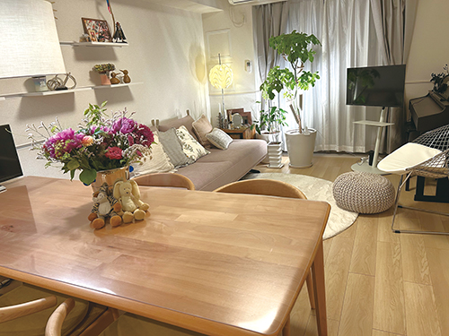 お部屋のテーマは「癒しの空間」。お気に入りの小物やグリーンなど、好きなものに囲まれた空間づくりを意識し、香りにもこだわっているMONAKAさん。複数の観葉植物や花を上手に組み合わせている点が評価されての入賞。