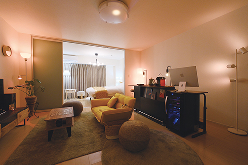 スタンド型、床置き型など複数の間接照明を組み合わせて部屋の印象をドラマチックに。ひとつはソファの横に設置すると、読書灯にもなって便利。「くつろぎの部屋としても、作業部屋としても使えるよう、メインの天井灯はあえてシーリングライトのままで。おすすめはリモコンで調光・調色ができるタイプ。手軽に部屋の雰囲気が変えられます。間接照明と上手に使い分けましょう」(くろださん)