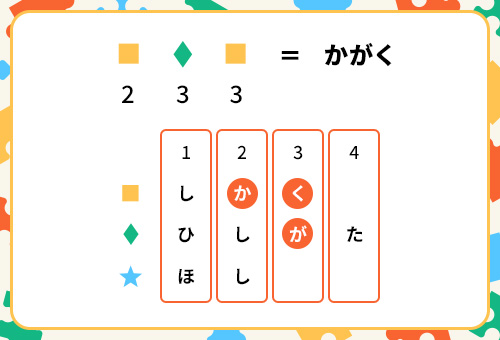 ヒント:■★♦の記号をそれぞれひらがなに直すと、関連性が見えてくるはず…。