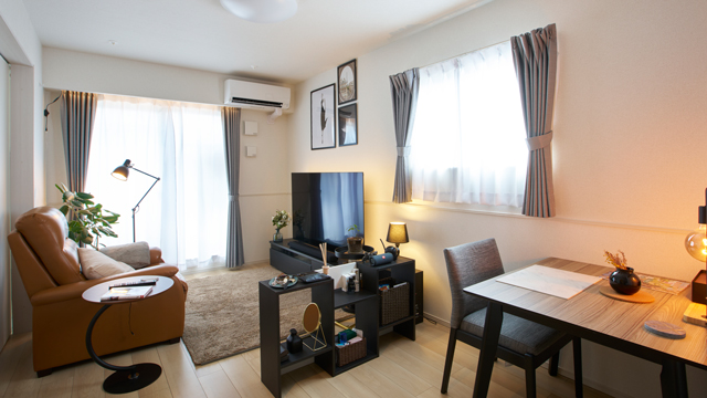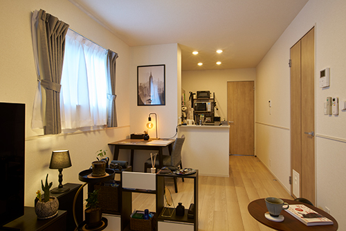ダイニング側はレストランのようなスペースにするため、リビングとの境目には小物が置けるラックで仕切りを作り、食事とくつろぎのスペースを分けています。家具も黒を基調にカラーコーディネートし、こだわりのチョイス!