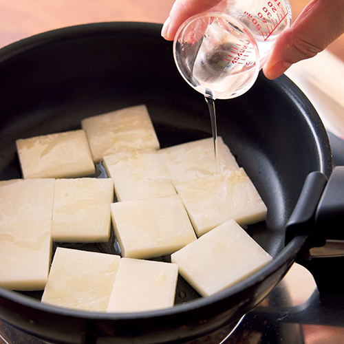 2. 直径20cmのフライパンにごま油大さじ1をひいてもちを並べ、水大さじ2をふりかける。ふたをして中火にかけ、約5分加熱する。