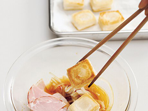 1. もちは横半分に切る。玉ねぎは横薄切りにする。パプリカは縦薄切りにする。ハムは縦横半分に切る。ボウルに玉ねぎ、パプリカ、ハム、たれの材料を入れて混ぜる。
