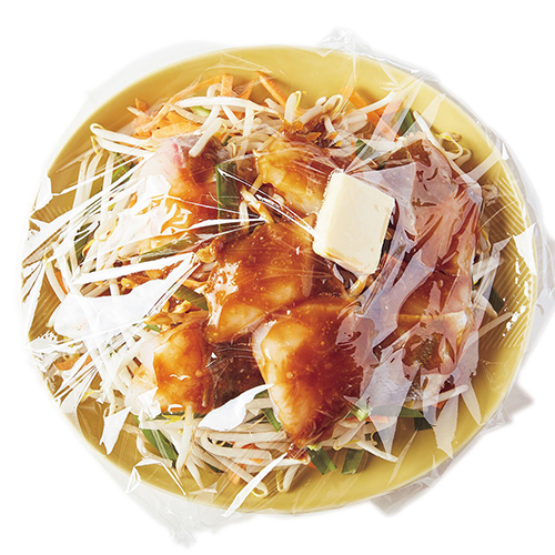 2. 耐熱皿にカット野菜を広げて1をのせ、合わせ調味料をかける。バター10gをのせてふんわりとラップをかけ、電子レンジで約5分加熱する。