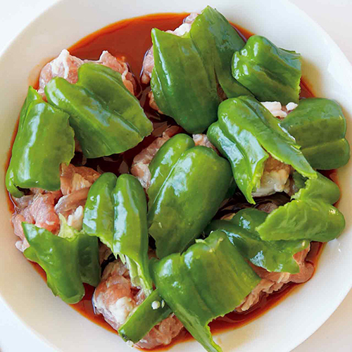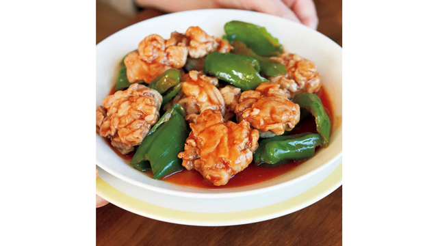 手でダイナミックにちぎったピーマンに肉のうま味と甘酢の味がよくしみて美味!
