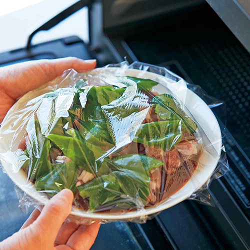 2. 直径約20cm、高さ5~6cmの耐熱の器に甘酢だれの材料を入れ、よく混ぜて底面に広げる。1を菜箸で8等分の一口大に軽くまとめ、間隔をあけて並べる。ピーマンは親指でへたを押してへたと種を取り除き、4~5等分にちぎってのせる。