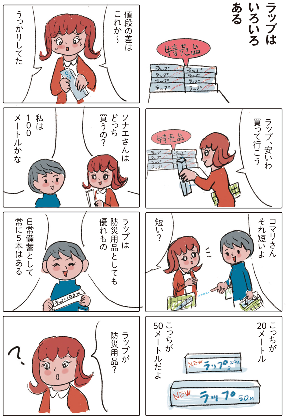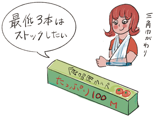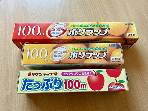 「緊急時には、ラップもたくさんあればあるほどありがたい。普段購入するときには、100mなど長いものを選ぶとよいですね。最低でも3本ストックがあると安心。わが家では、4本は常備するよう心がけています」と草野さん。