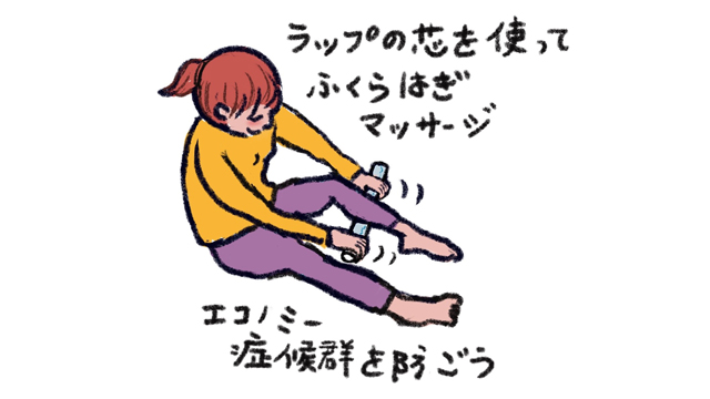 「予防のためには、足踏みや、ふくらはぎ・太もものマッサージが有効。ラップの硬い芯を捨てずにとっておき、コロコロと転がしてマッサージすることも覚えておいてください」と草野さん。
