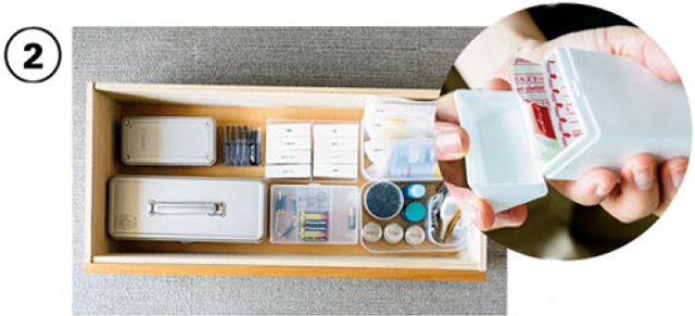 箱のサイズがバラバラな飲み薬や絆創膏は、白いタバコケースに詰め替えて統一感を。