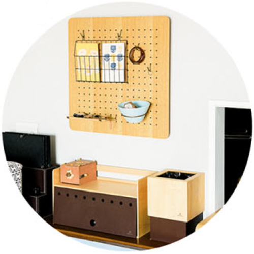 テーブルにちょい置きしがちな腕時計や指輪は、壁にかけた有孔ボードで見せる収納に。