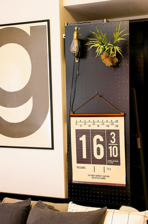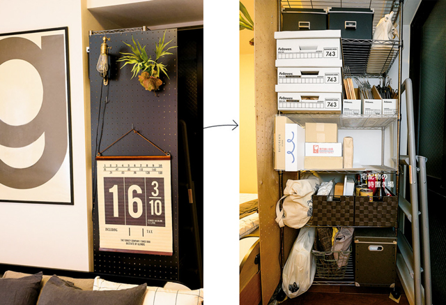 奥にはストックスペースとしてスチールラックを置いていますが、生活感を隠すため有孔ボードをワイヤーで取リ付けています。ライトやフェイクグリーンも飾り、インテリア性もUP。