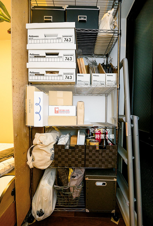 有孔ボードの裏にあるストックスペースの一番置きやすい中央を、届いた宅配へ、物の一時置きとして活用しています。その他の棚に季節外の浴衣やリース、予備のハンガーなどをボックスに入れて収納。また、雑多に見えがちな雑貨や使用頻度の低いミシン、収納グッズの予備などもこちらに収納。このスペースがあるだけで、他の部屋のごちゃつきが抑えられます。