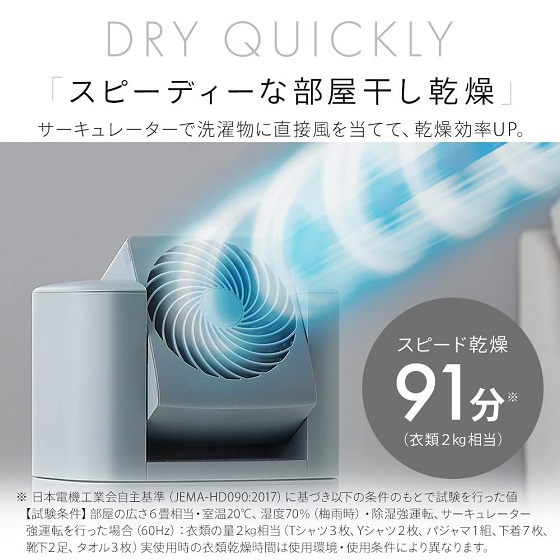スパイラル気流の送風で湿気を飛ばしながら除湿するので、衣類乾燥に最適です。