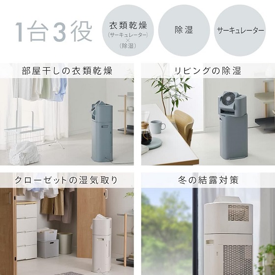 1台で3役!(サーキュレーター・除湿機・衣類乾燥機)単独機能でも運転可能で、空気の循環、撹拌やお部屋の除湿にも使えます。ヒーターを使った除湿方式(デシカント式)なので、1年中、安定して除湿ができます。
