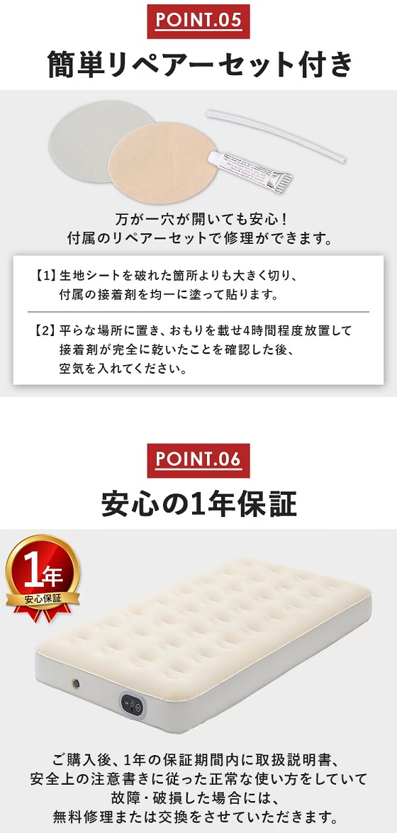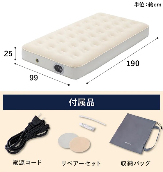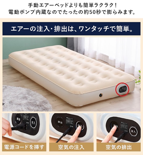電動ポンプ内臓で、エアーの注入・排出もワンタッチで簡単にできます。