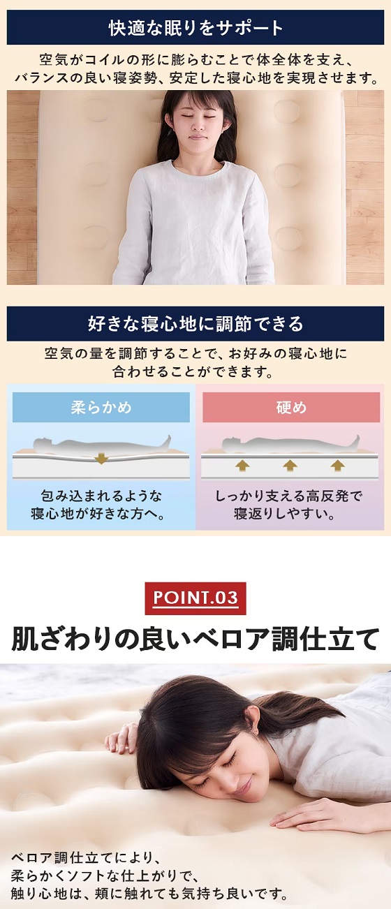 25㎝のボリュームで、固い床の上でも底付きが感なく、ふかふかな寝心地です。