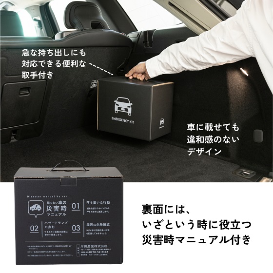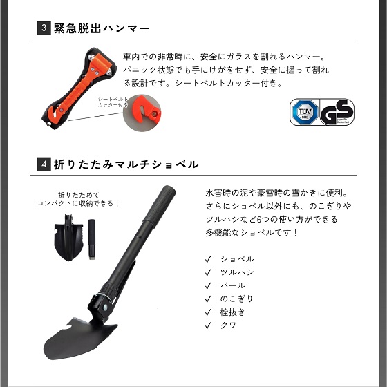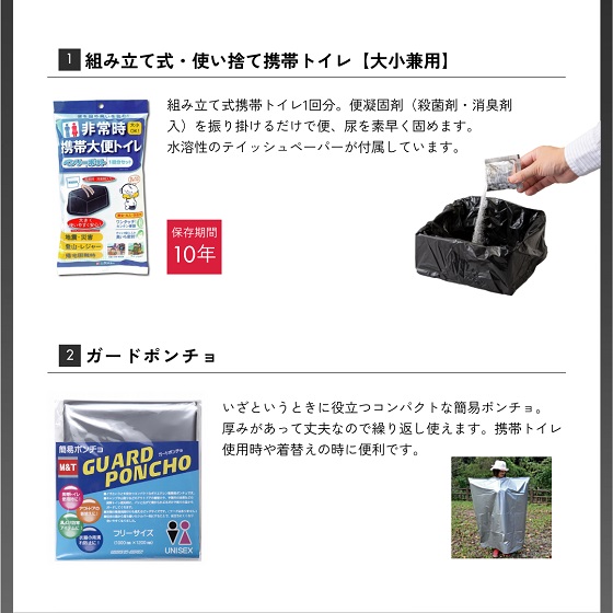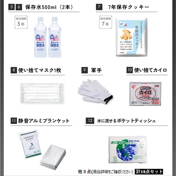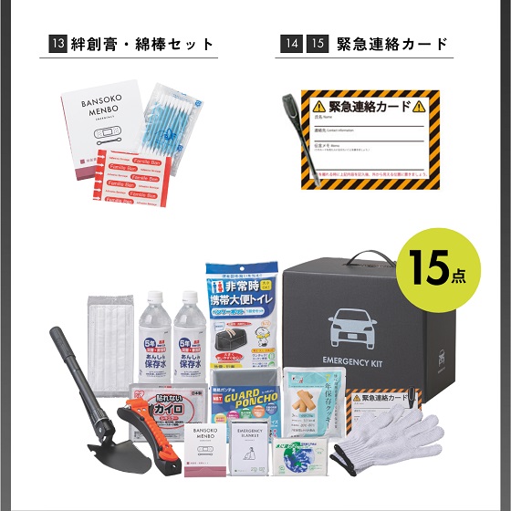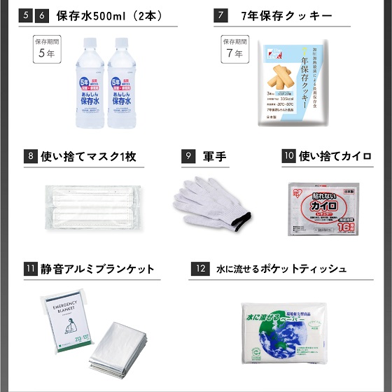 緊急脱出ハンマー、ガードポンチョ、折りたたみマルチショベル、保存水500ml×2本、7年保存クッキー、ベンリーポット、緊急連絡カード、クリップペンシル(キャップ付き)、使い捨てマスク、軍手、静音アルミブランケット、水に流せるポケットティッシュ、使い捨てカイロ、絆創膏+綿棒セット