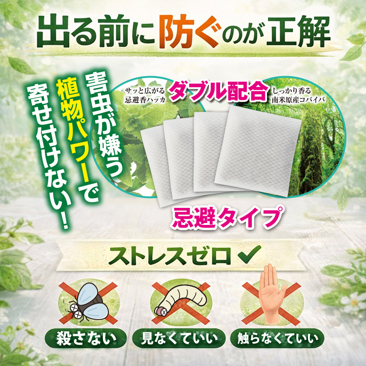 ■天然香料で寄せつけない忌避タイプなので、見ることも近づく必要もありません。